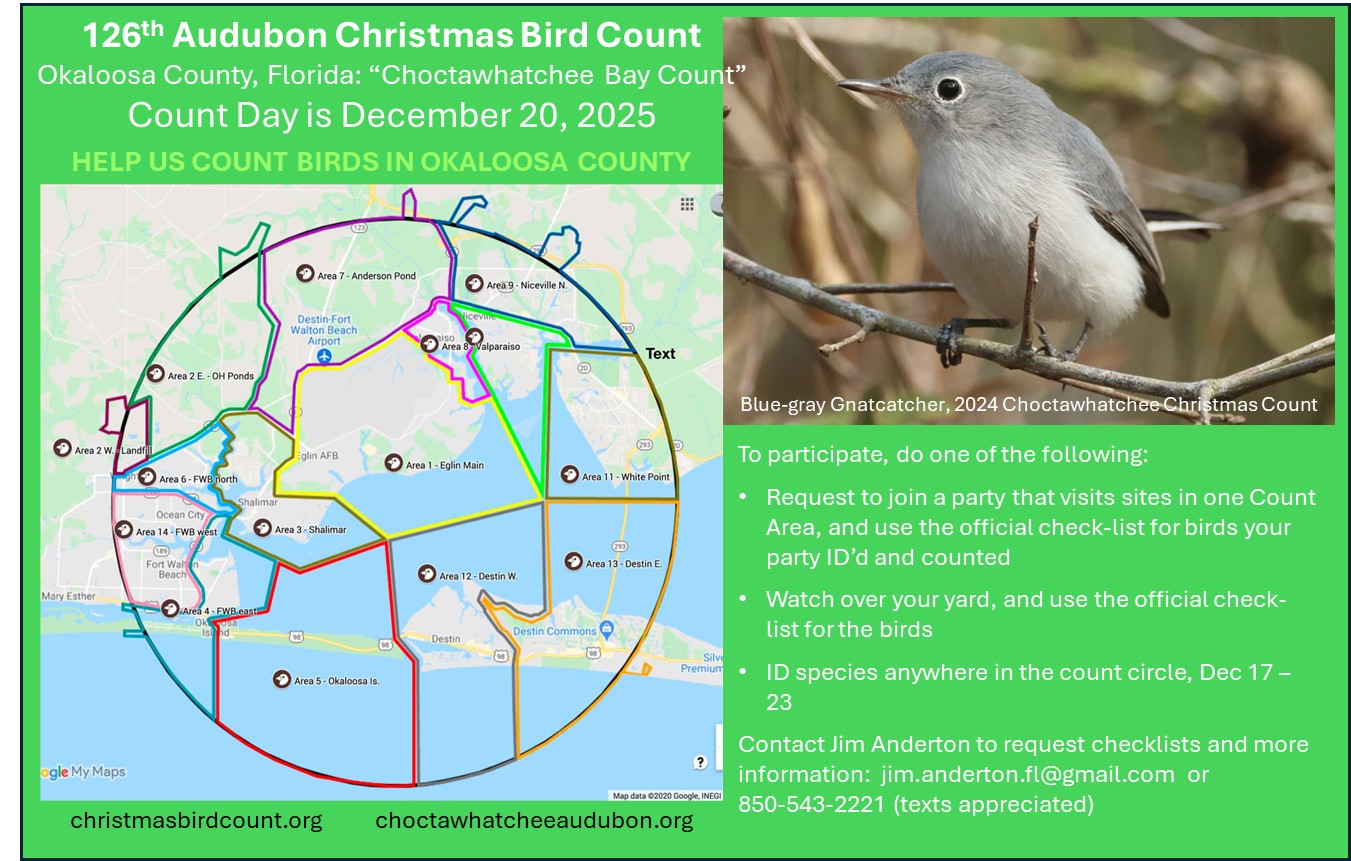2025 December 20 SATURDAY Choctawhatchee Audubon CHRISTMAS BIRD COUNT 2025. Jim Anderton coordinates our Audubon CBC circle in this worldwide citizen science event (all experience levels welcome). The 15-mile-diameter circle is centered 4 mi N of the Marler (Destin) Bridge over East Pass, and the circle is divided into many "Areas" for the different parties of observers. Contact Jim (850.543.2221 to text) to participate in one of the parties or your own party. PDF with local bird ID tips